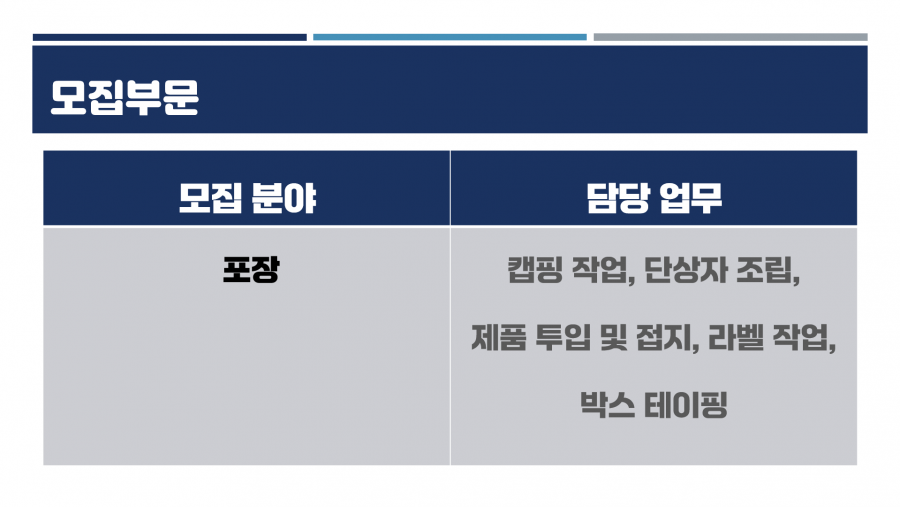 여성 > 포장팀 : 캡핑작업, 단상자조립, 제품 투입 및 접지, 라벨작업, 박스 테이핑